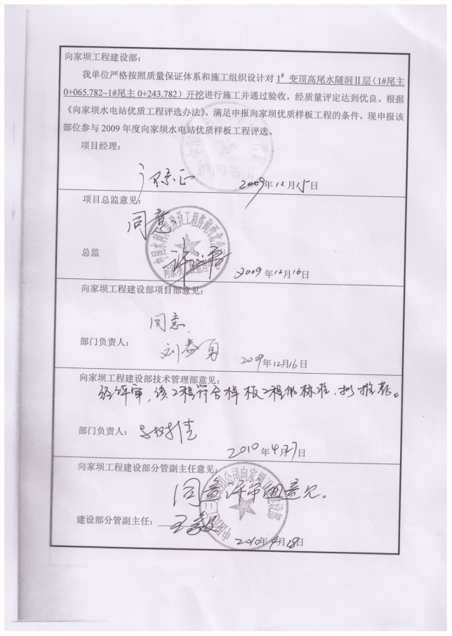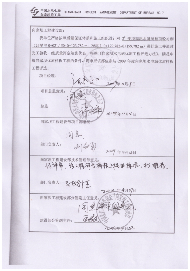 工程概述:向家坝水电站位于云南省水富县(右岸)和四川省宜宾县(左岸)境内。电站上距溪洛渡电站坝址157公里,下距水富县城区1.5公里、宜宾市区33公里。向家坝水电站是金沙江最后一级水电站。正常蓄水位380米(现在水位约为270米),死水位(供水期未发电消落水位)370米。水库面积95.6平方公里,水库为峡谷型水库。控制流域面积45.88万平方公里,占金沙江流域面积的97%。水库总库容51.63亿立方米。回水长度156.6公里。向家坝电站装机容量600万KW(共8台机组,每台75万KW),正常蓄水位380米时,保证出电200.9万KW,多年平均发电量307.47亿KW.H,装机年利用小时数5125小时下引水发电系统变顶高尾水隧洞工程施工。向家坝加上1260万千瓦的溪洛渡电站,其总发电量约大于三峡水电站。我司主要承建电站右岸地